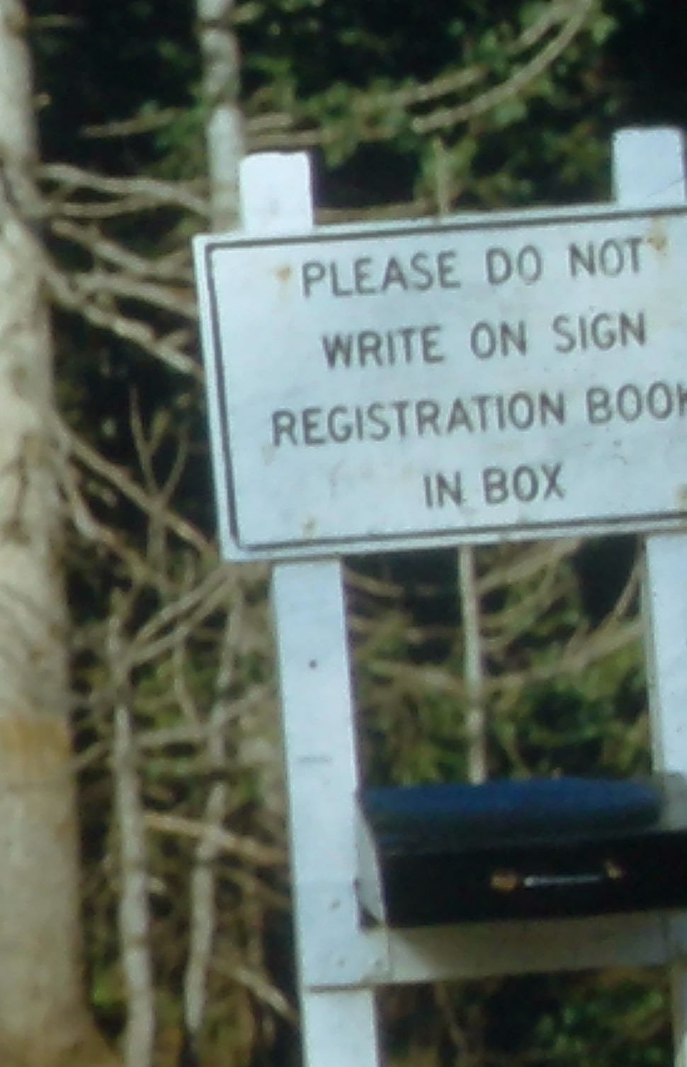 The enlarged image below shows the traveler’s registration box that was located to the right of the sign.