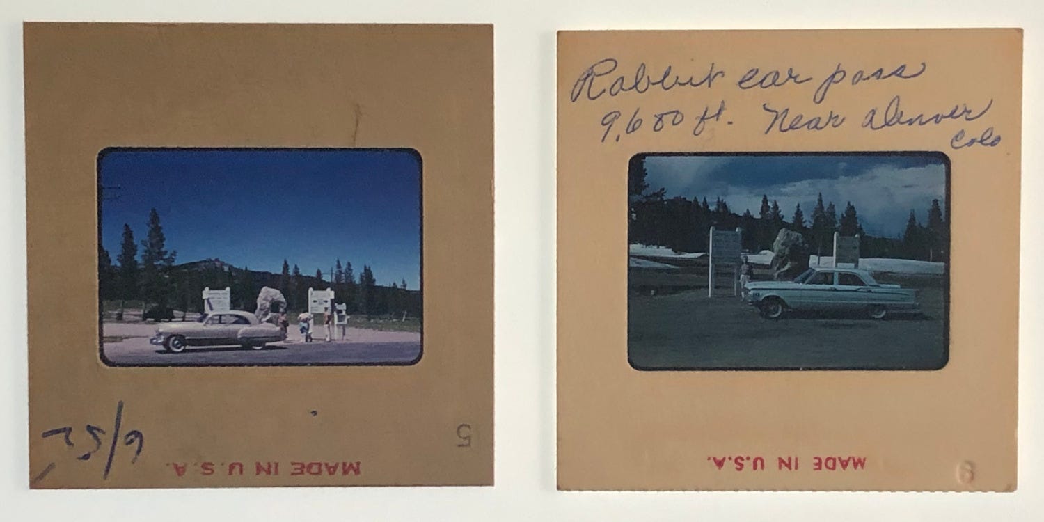 These two slides had their fronts and backs photographed on the light table this week for their respective webpages. The slide on the left is from 1952. The slide on the right is undated, but the vehicle has been identified as a 1961 Mercury Comet.