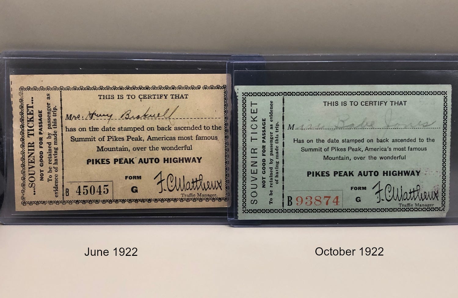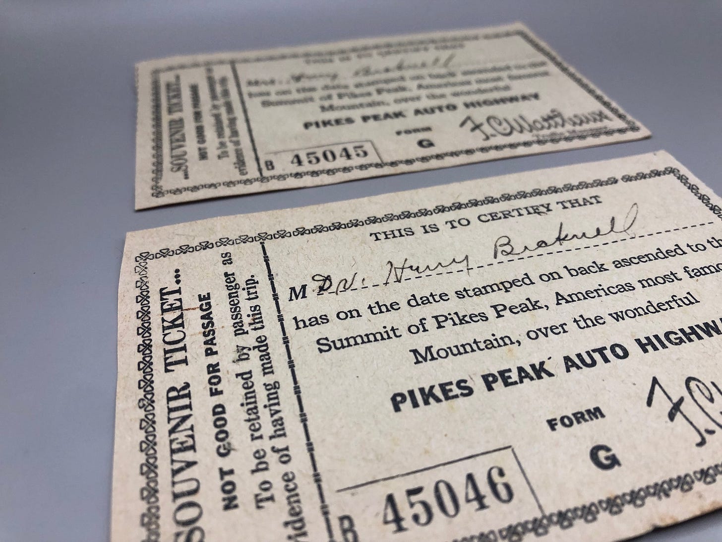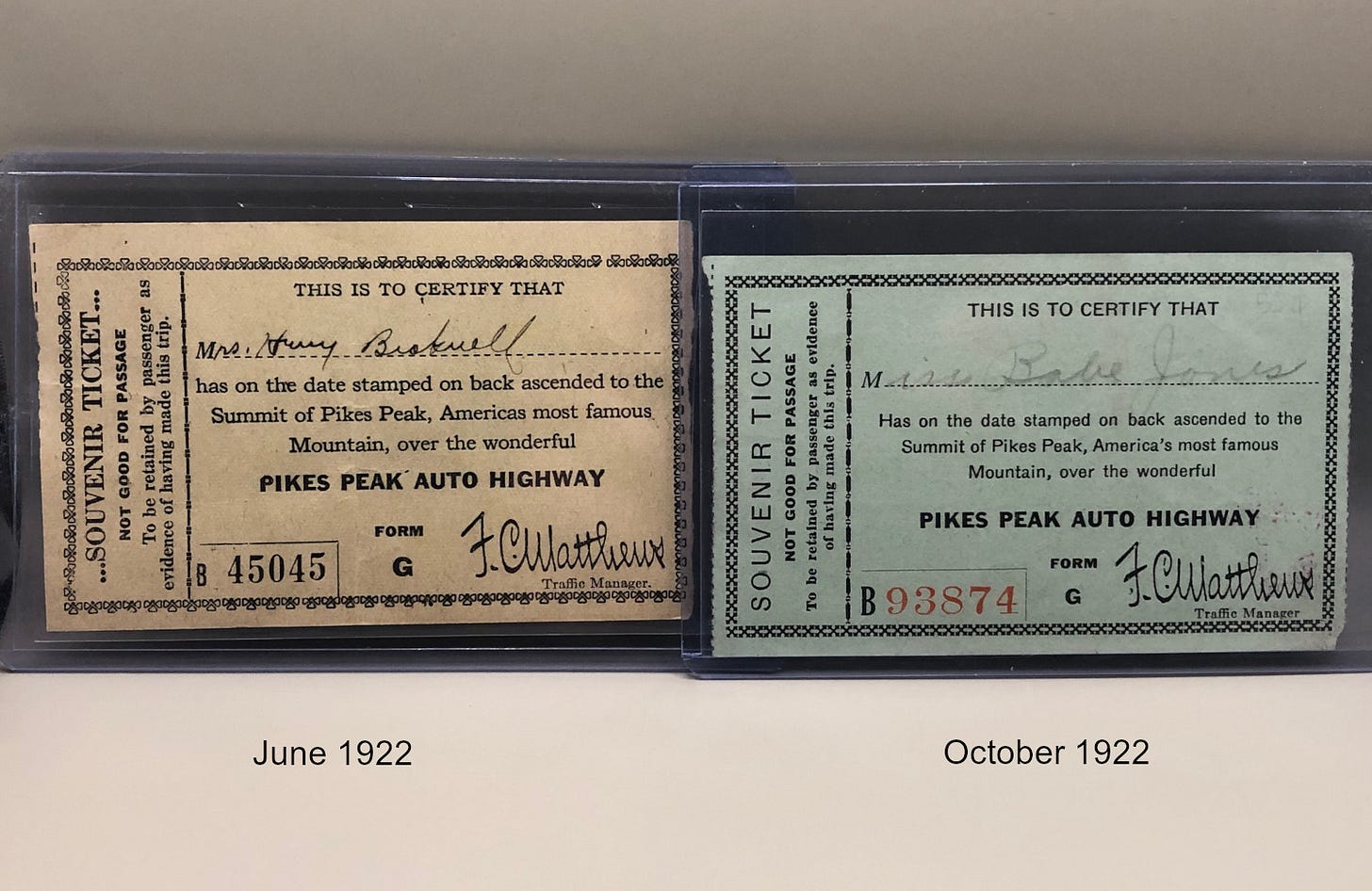 The Colorado toll road ticket collection has grown again this week. A pair of Pikes Peak souvenir tickets from 1922 was catalogued, in addition to a toll receipt from 1981.