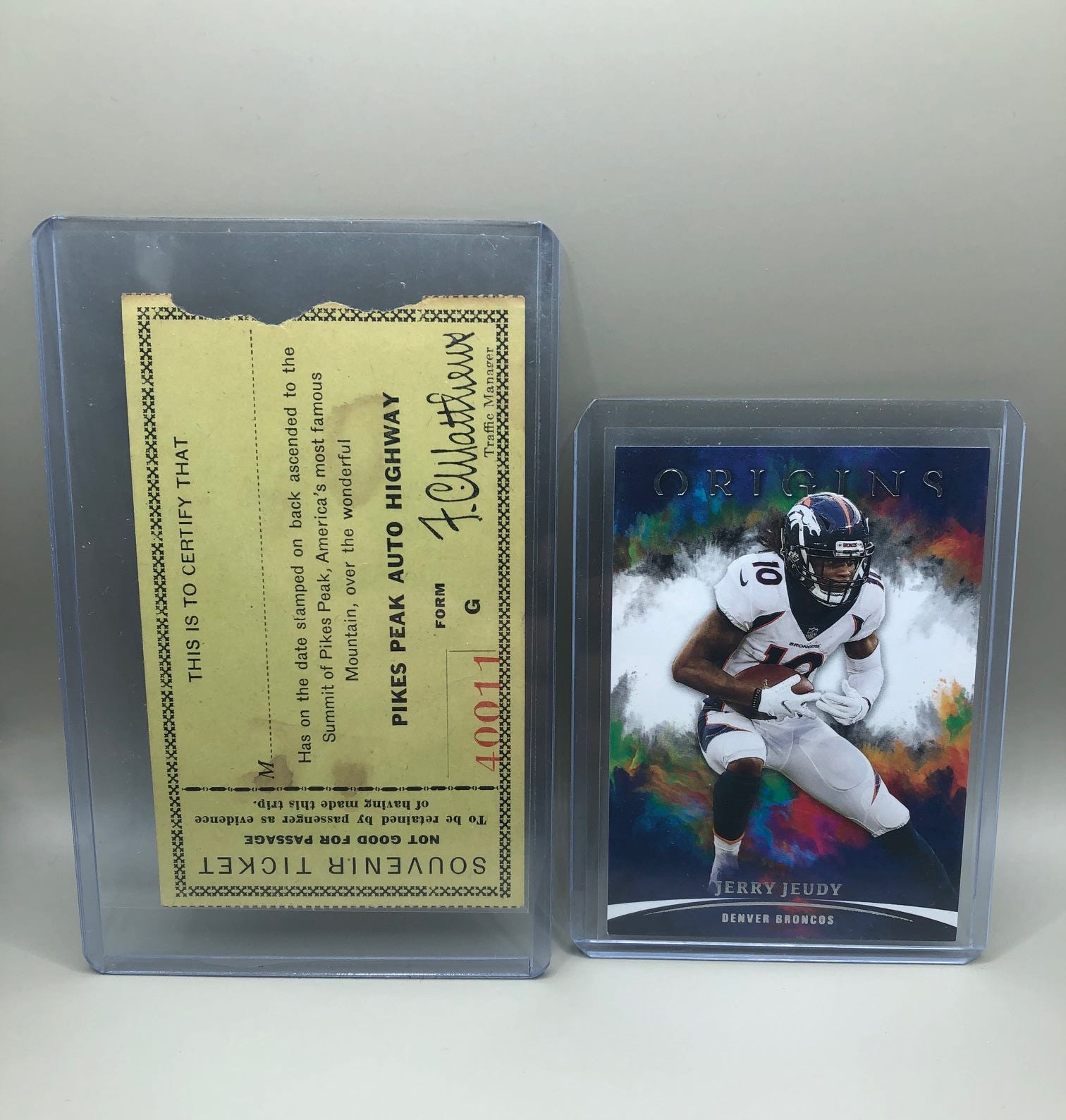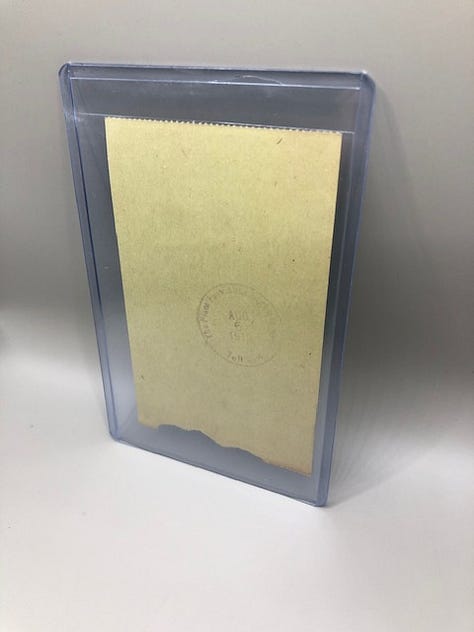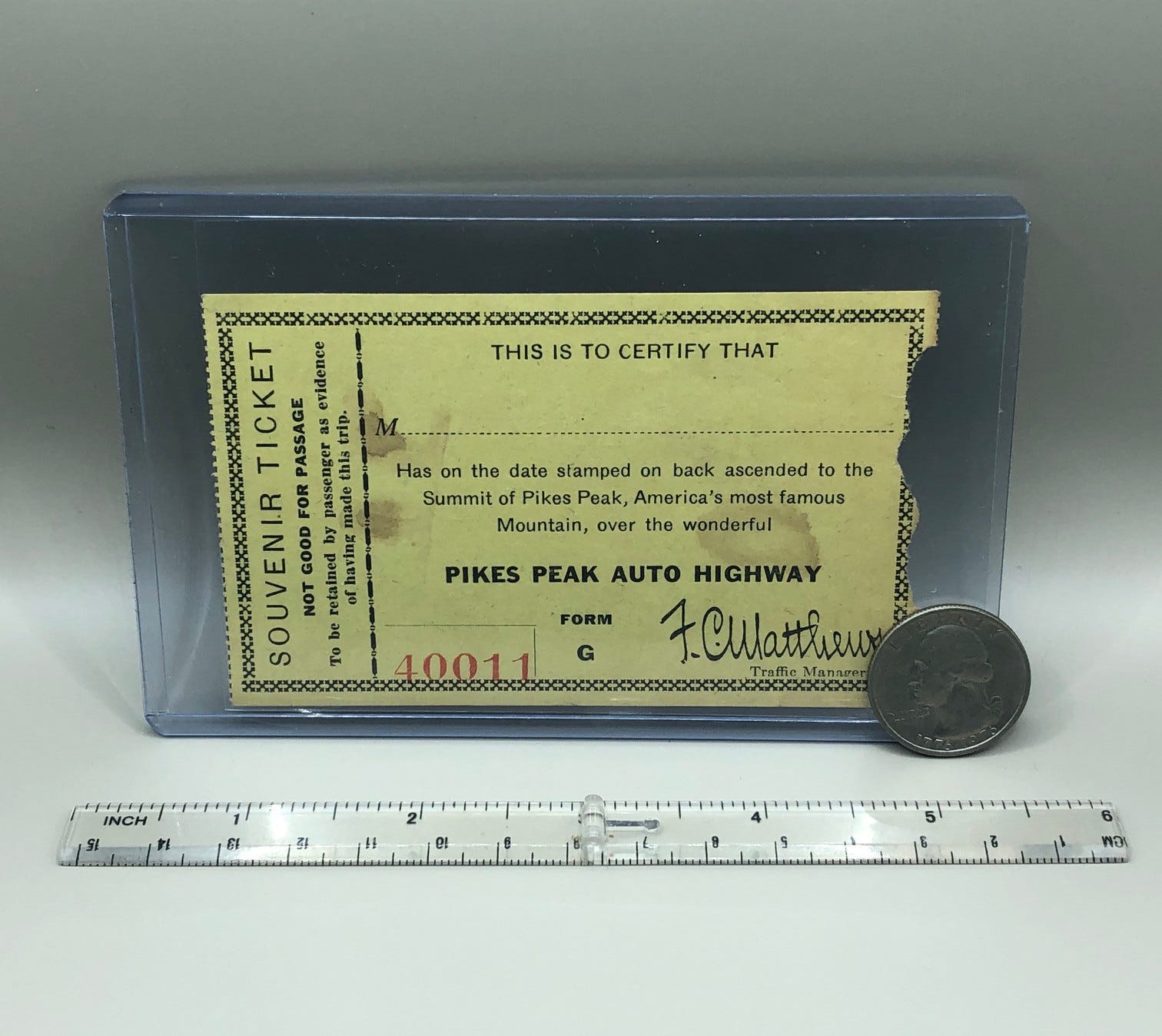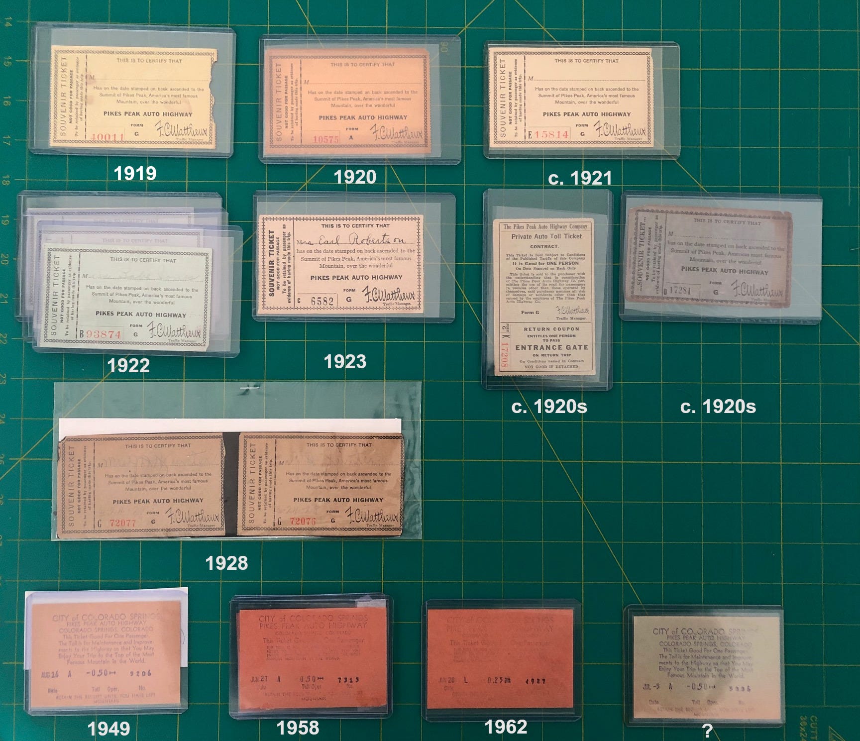 These early Pikes Peak tickets are stored in 3” x 5” toploaders. Those are easy to find, but the polypropylene sleeves are trimmed on a cutting mat using a pizza cutter-style blade.